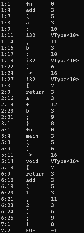 Finally I made a method to print out the tokens by line and column numbers, the value of the token, and then the type. If the token is a type then the type number is replaced with an annotation that it is a type and gives the type value.